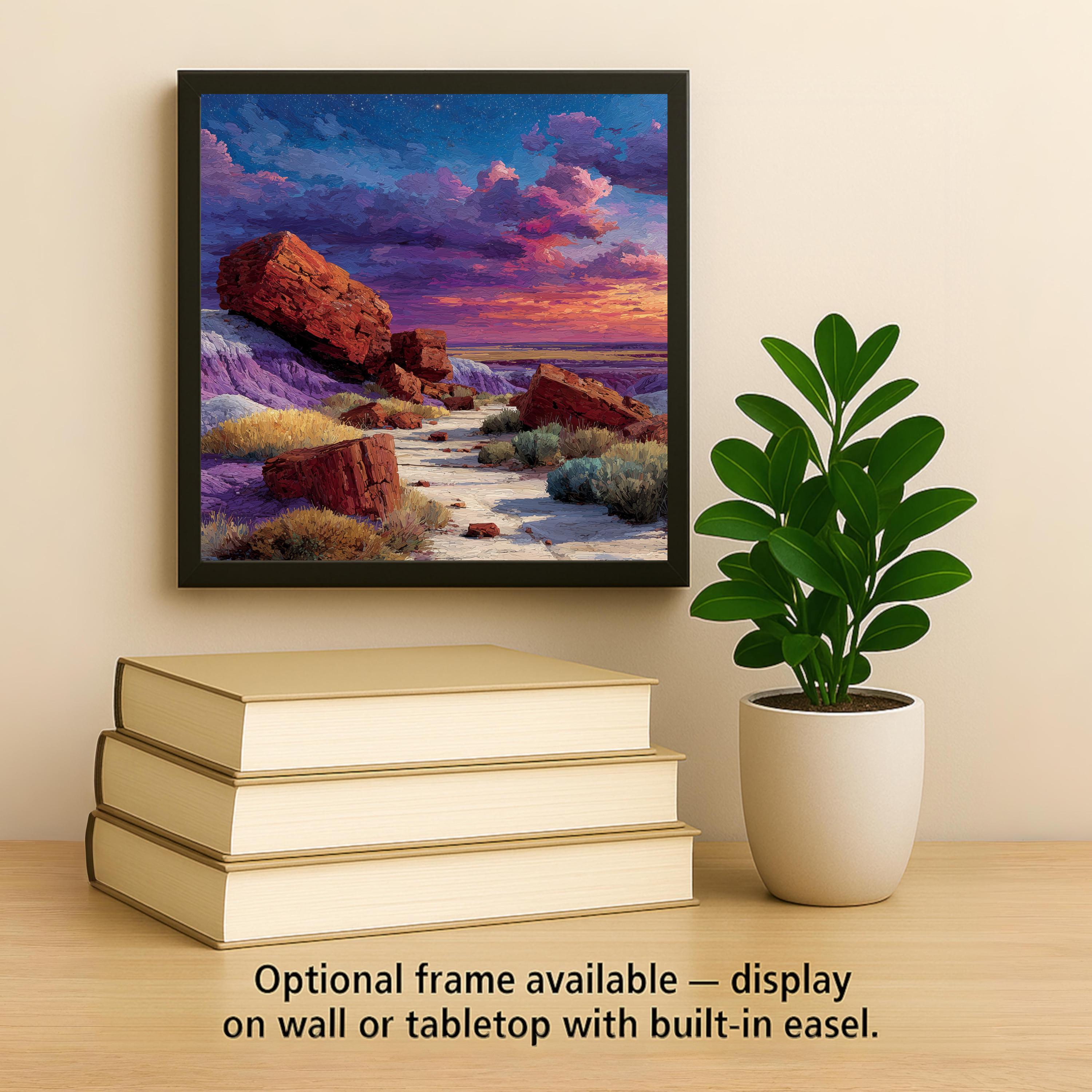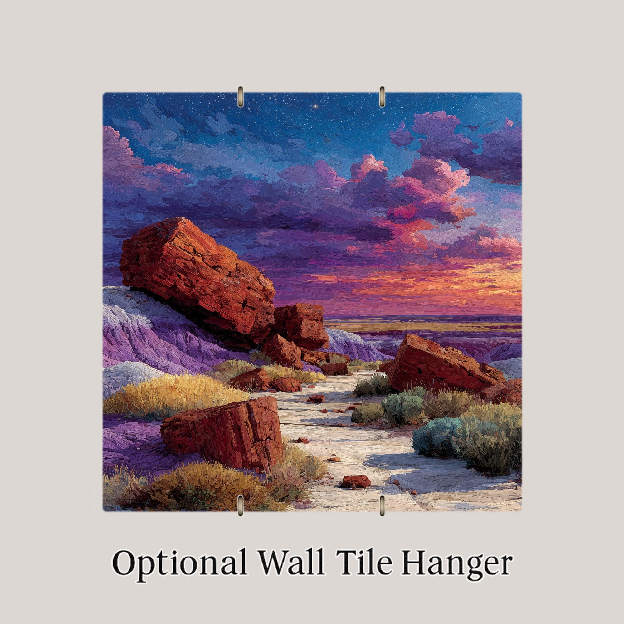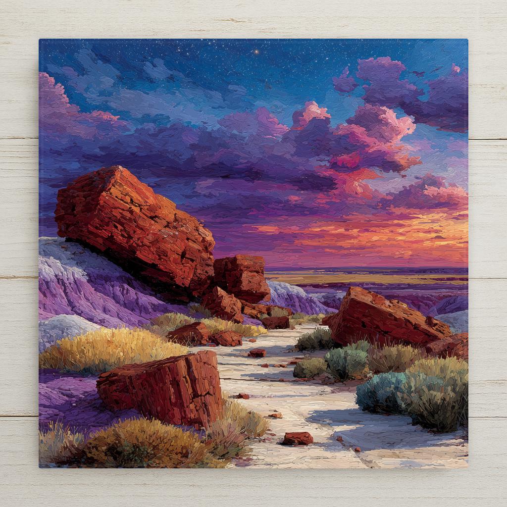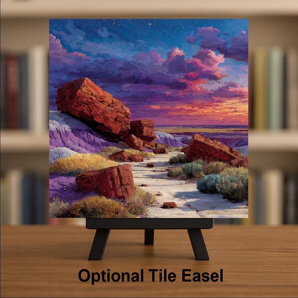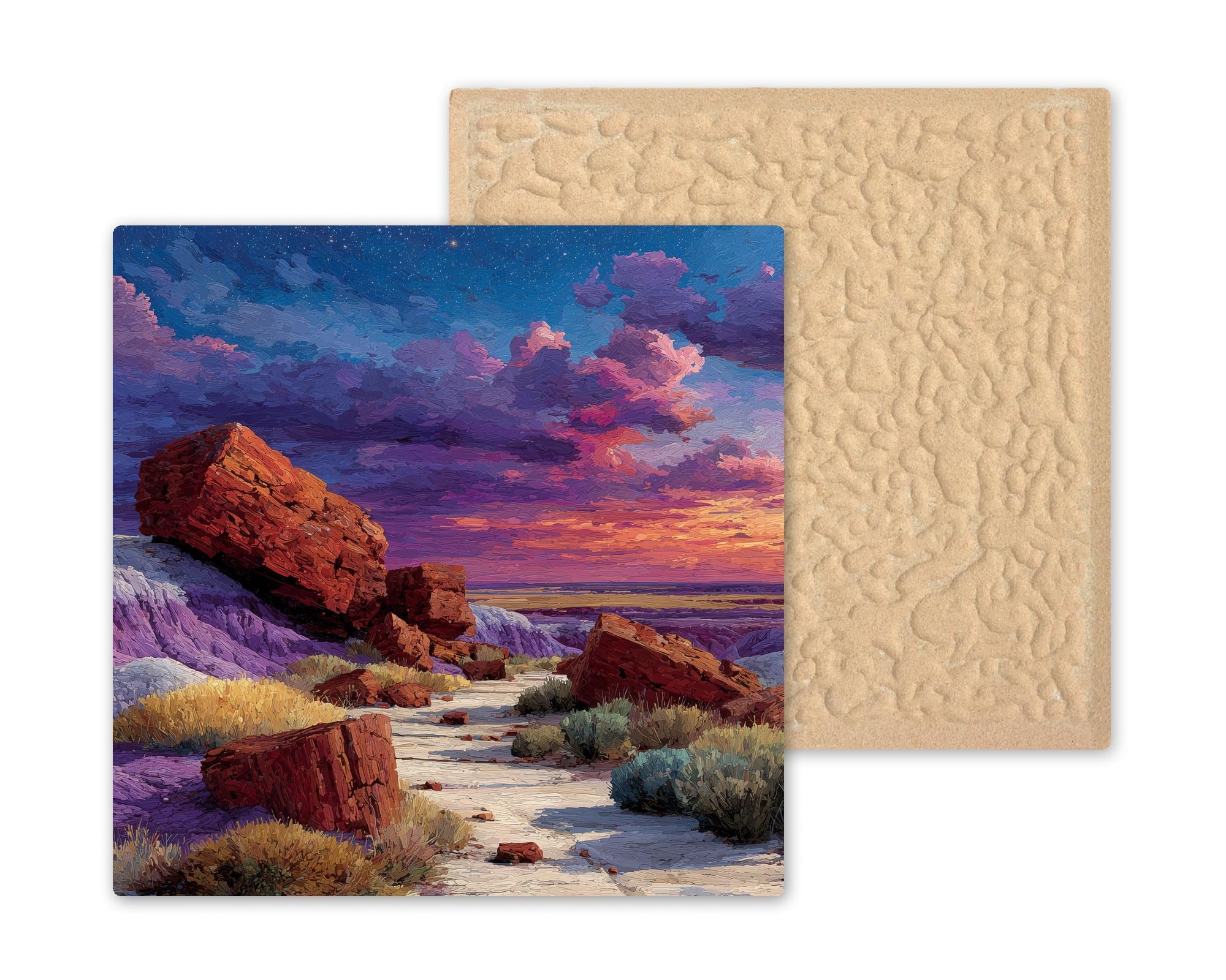 The Petrified Forest is Arizona at its most geological and most unexpected — a place that requires you to recalibrate your sense of time. As a gift it reaches the Arizona resident who knows there is more to the state than Grand Canyon and Sedona, the geology enthusiast who understands what they are looking at, and the road tripper who pulled off I-40 and walked among two-hundred-million-year-old trees turned to crystal. The jewel-toned desert palette of purple, amber, and red renders with exceptional richness on ceramic.