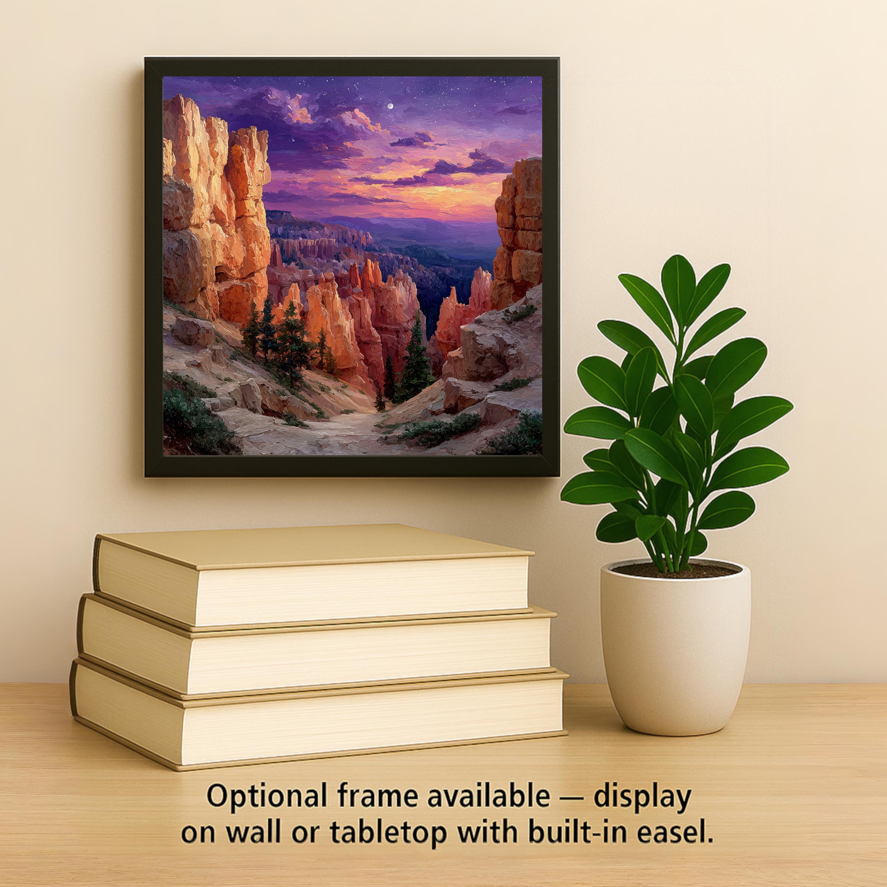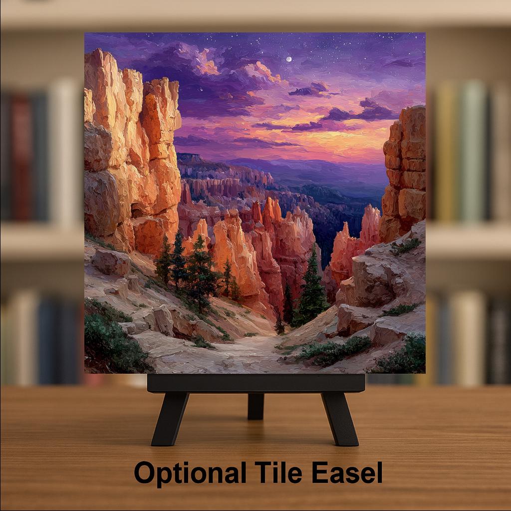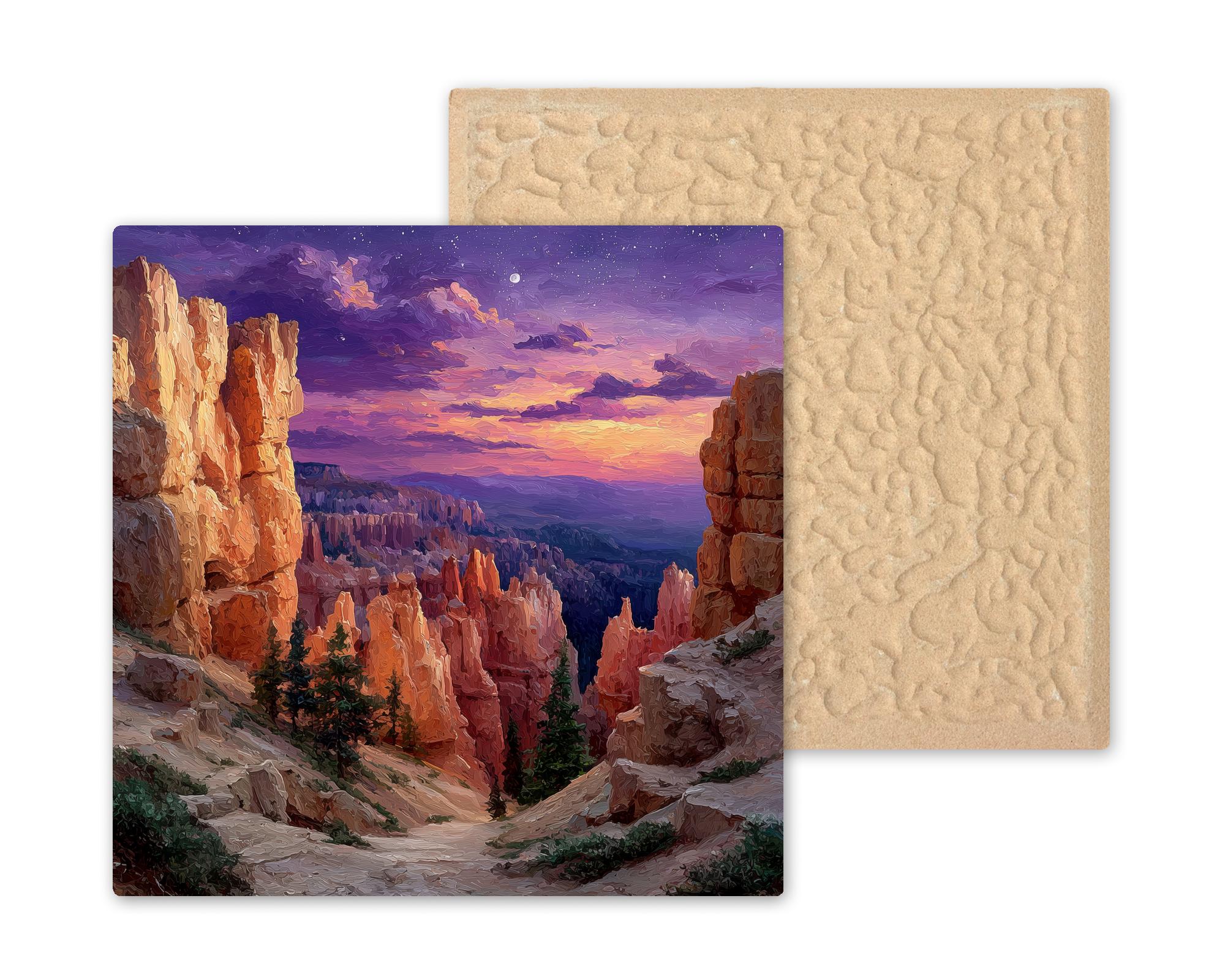 Bryce Canyon is a hiker's park as much as a scenic overlook, and the people who hike the Fairyland Loop or the Rim Trail tend to carry it differently than drive-through visitors. This tile speaks to that hiker identity — the person who put in the miles and watched the sunset from the canyon rim rather than the parking lot. The purple dusk palette differentiates it from the warm sunrise and jewel-toned stained glass versions, so all three can share a wall without repeating.