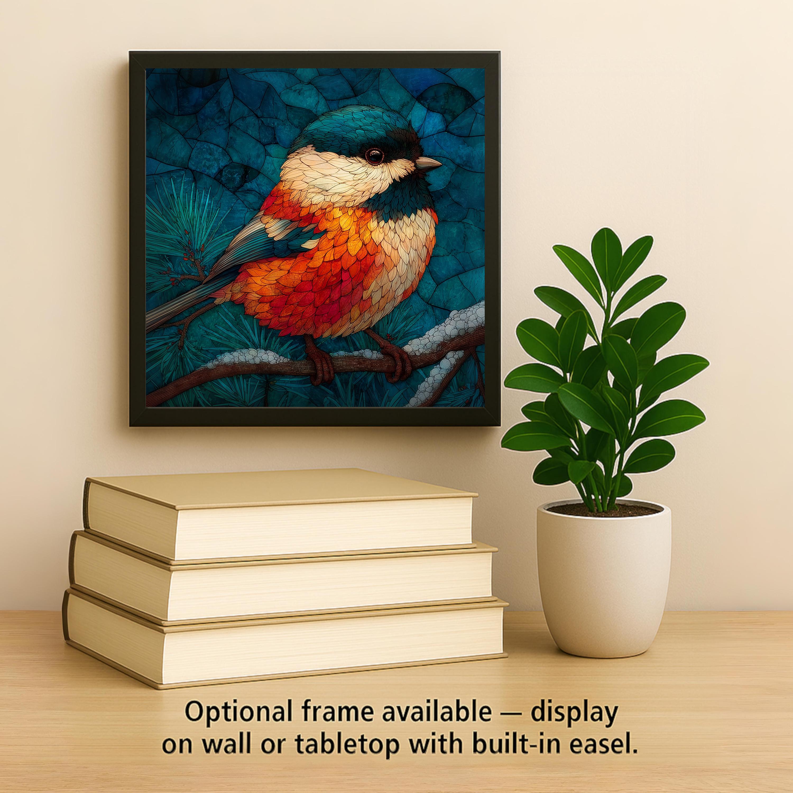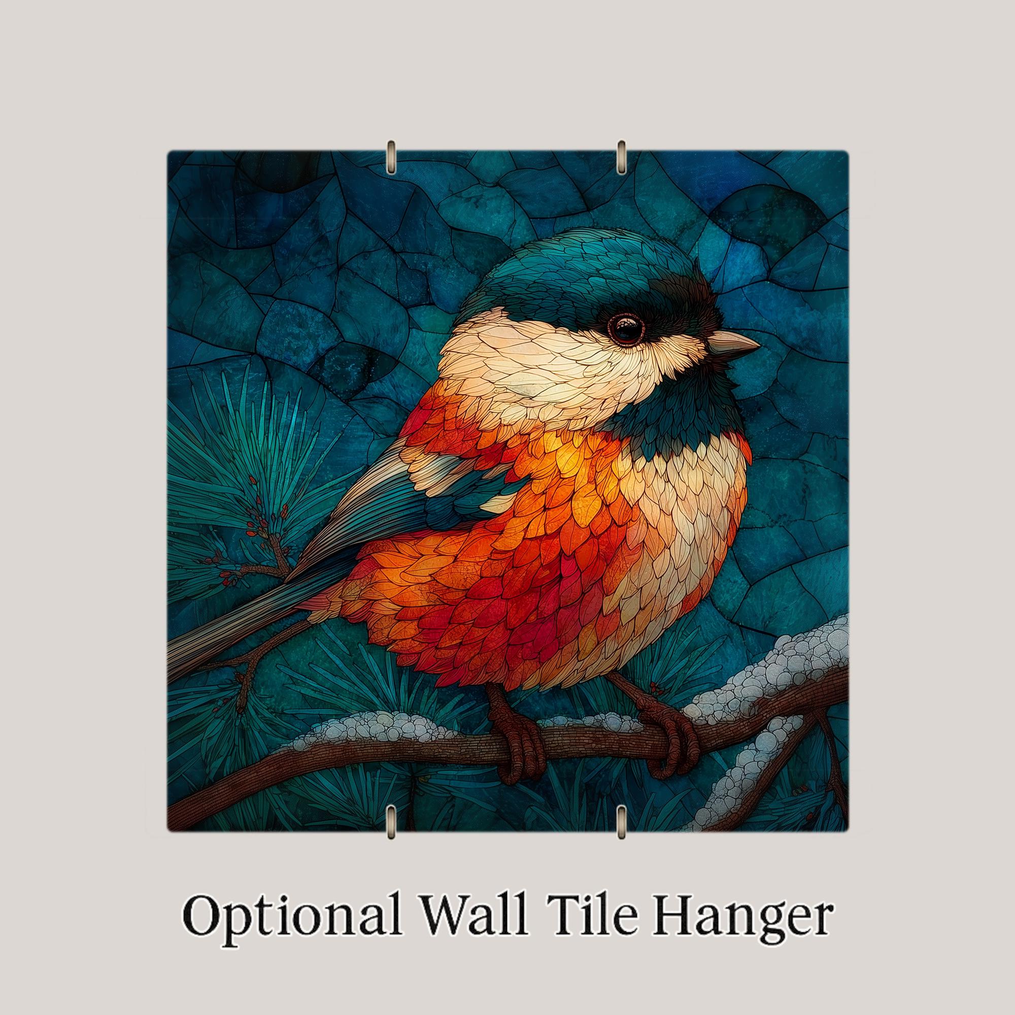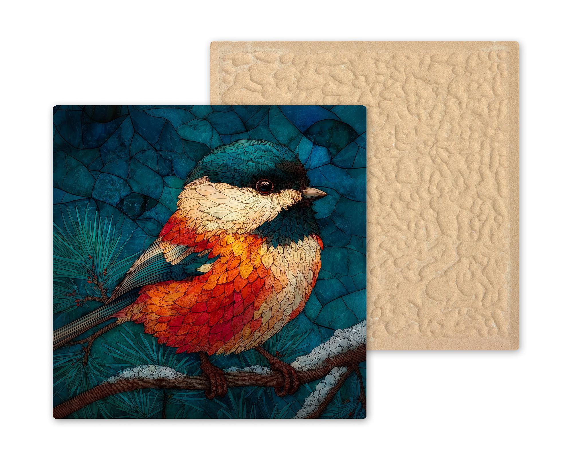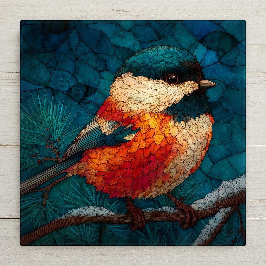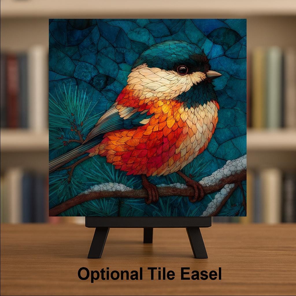 The chickadee carries quiet memorial weight for a lot of people — it is the bird that stayed at the feeder through the winter after a loss, the bird that landed on a branch on a hard day, the bird associated in many traditions with messages from those who have gone. The stained glass treatment amplifies that quality: luminous, permanent, held in light. This tile works for the birdwatcher who simply loves chickadees, the grief gift buyer looking for a sympathy piece, and anyone who keeps a feeder and has a relationship with this particular small brave bird.