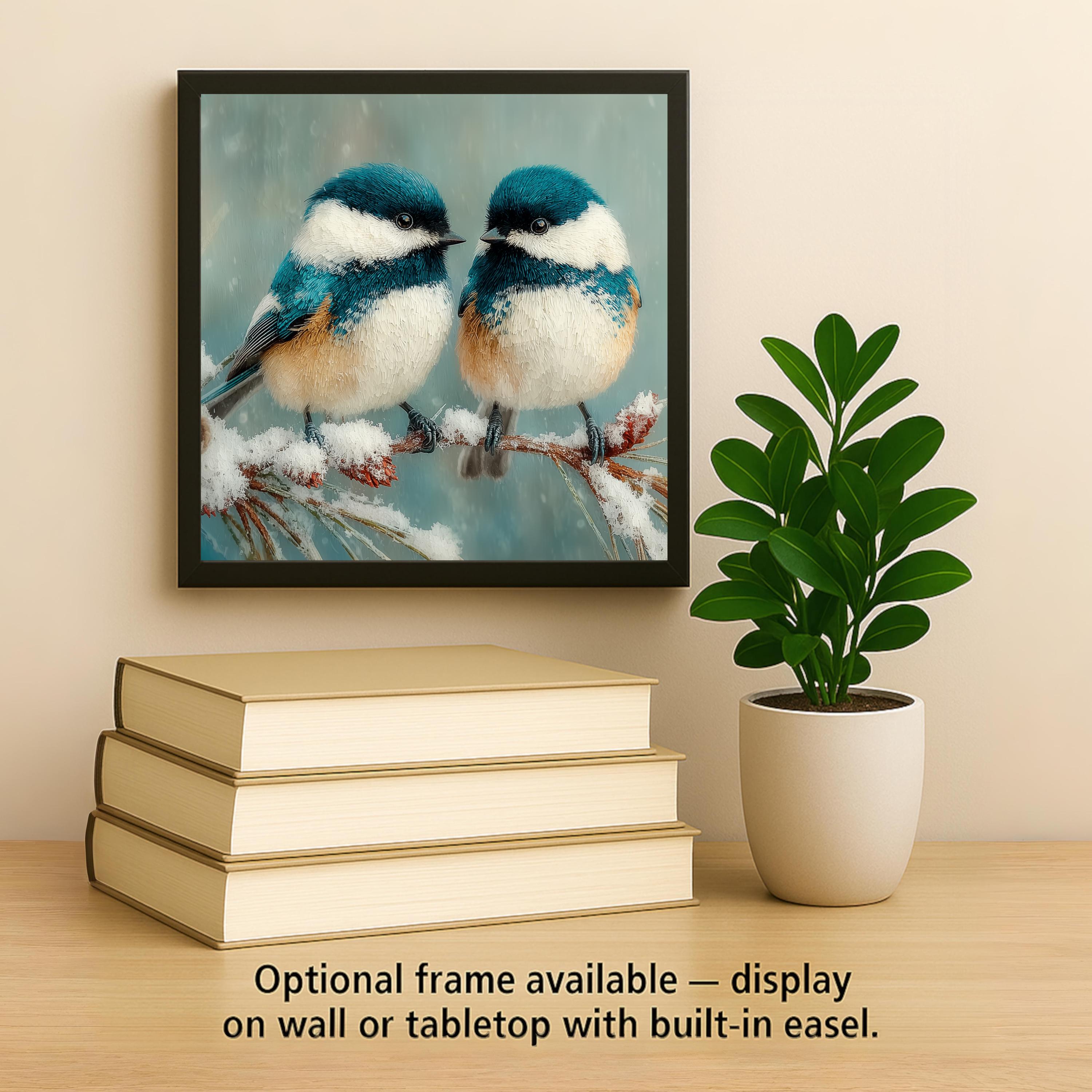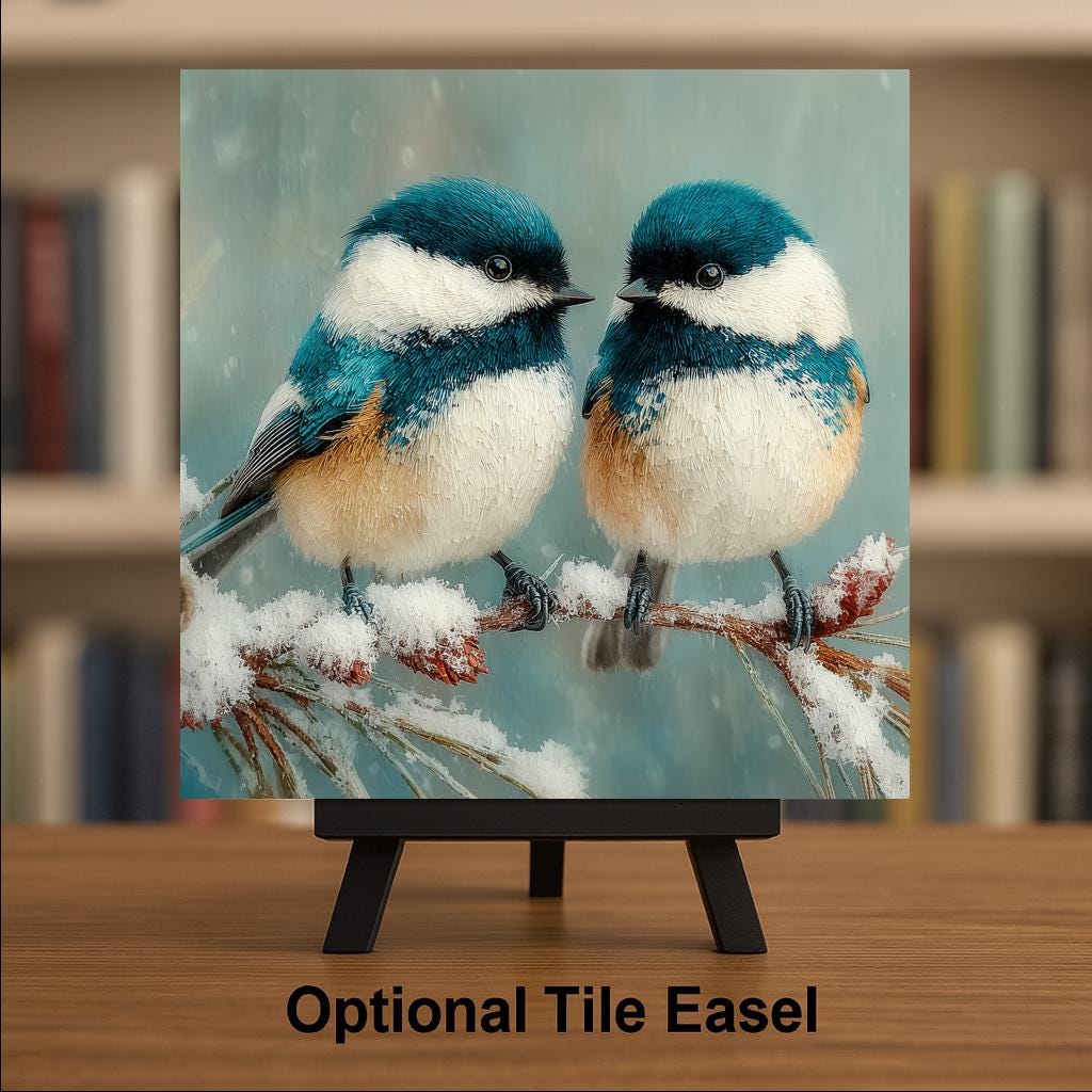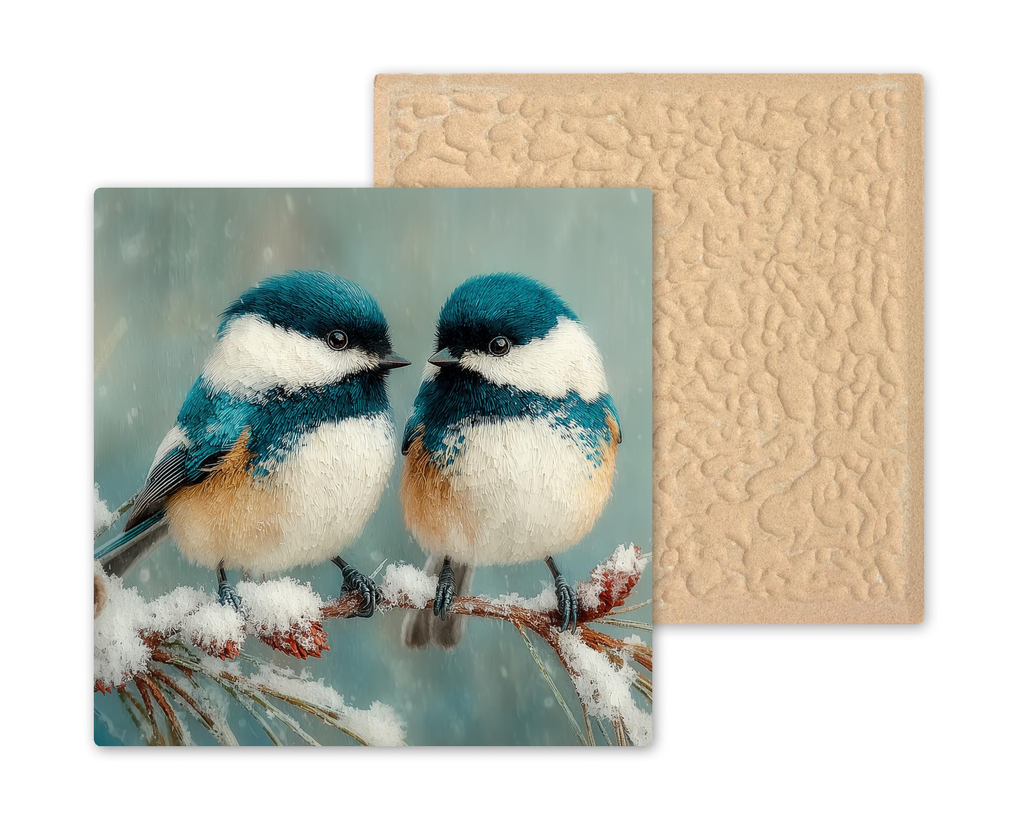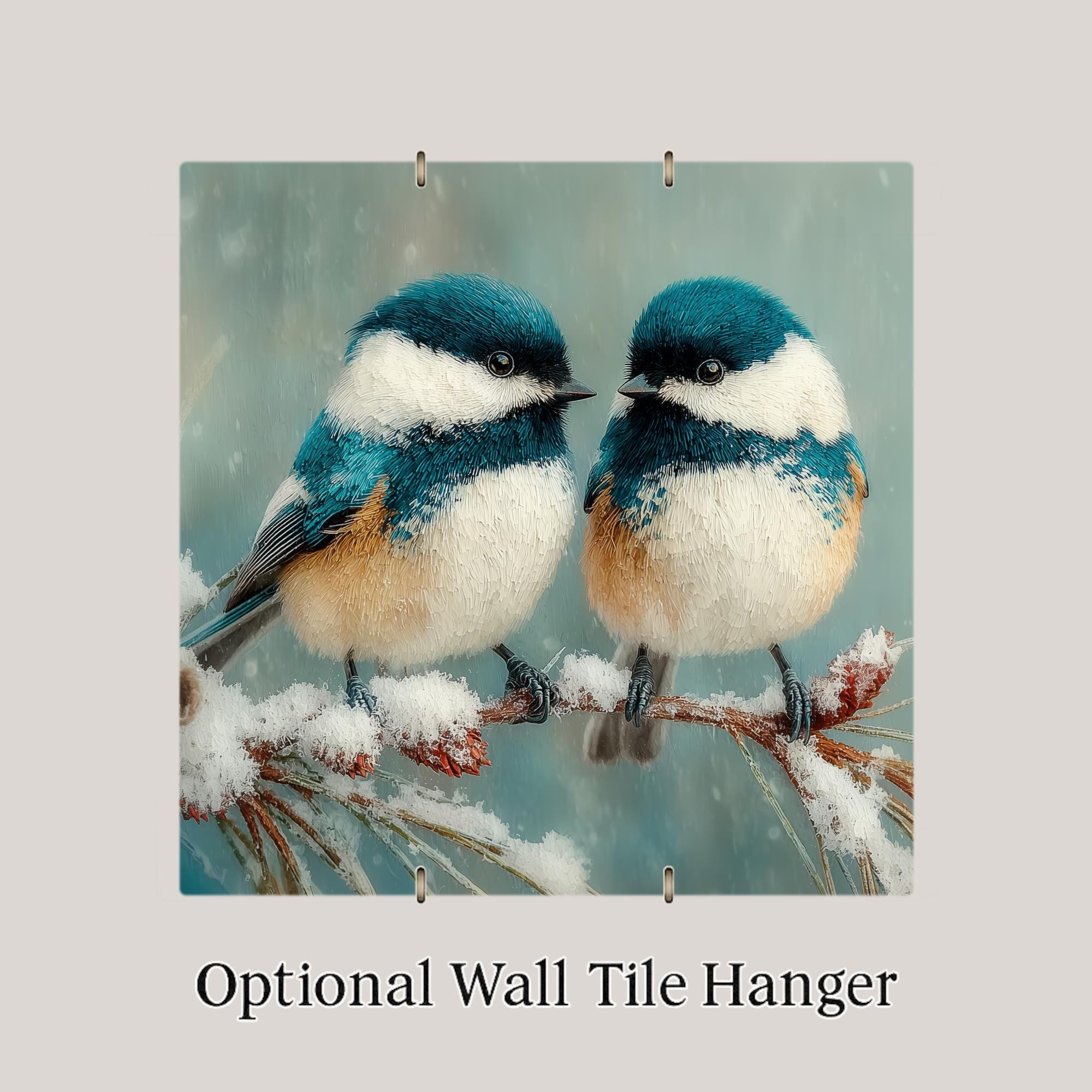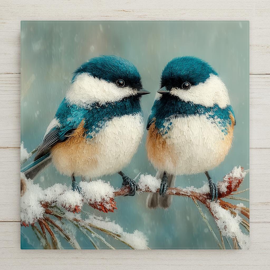 The winter chickadee image speaks to a deeply familiar feeling — the cold morning, the feeder outside the window, the small burst of life and color that makes winter bearable. This tile works for the cabin owner, the winter feeder keeper, the birdwatcher who has watched chickadees through January windows, and anyone who associates these birds with the particular warmth of getting through a cold season. The cool blue-white and warm chestnut palette is distinctly wintry without being Christmas-specific, making it a year-round piece for the person who loves winter.