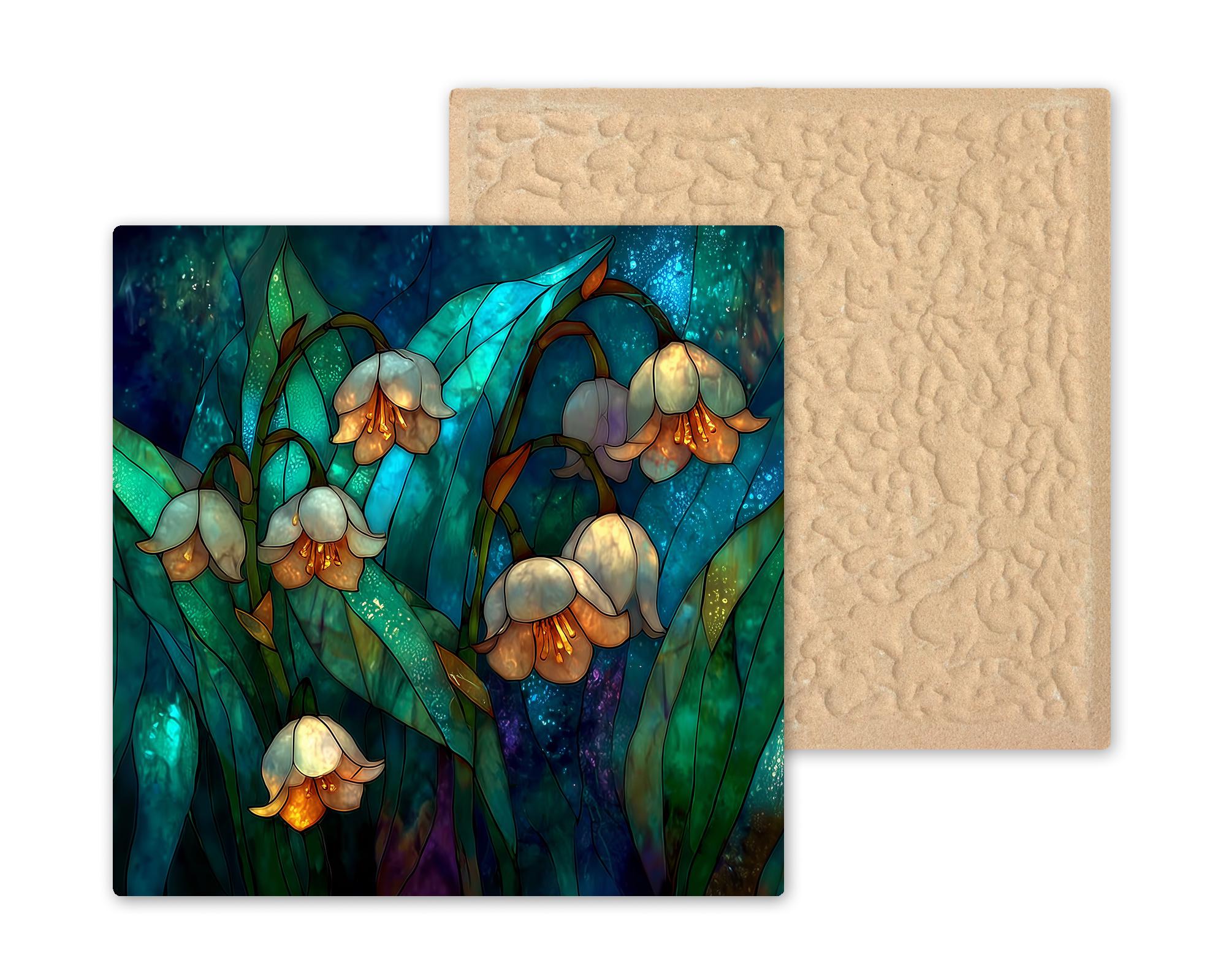 The lily of the valley is the birth month flower for May — delicate white bells hanging from arched stems above paired lance-shaped leaves, one of the most distinctive and beloved flowers in the Northern Hemisphere. It blooms briefly, strongly scented, in the cool light of late spring before the trees fully leaf out. In stained glass style it becomes something exquisitely architectural: the bell-shaped flowers rendered in pure white and pale jade, each tiny bloom a small jewel, the arching stems segmented in deep emerald, the whole composition lit from behind with the filtered light of a May morning.