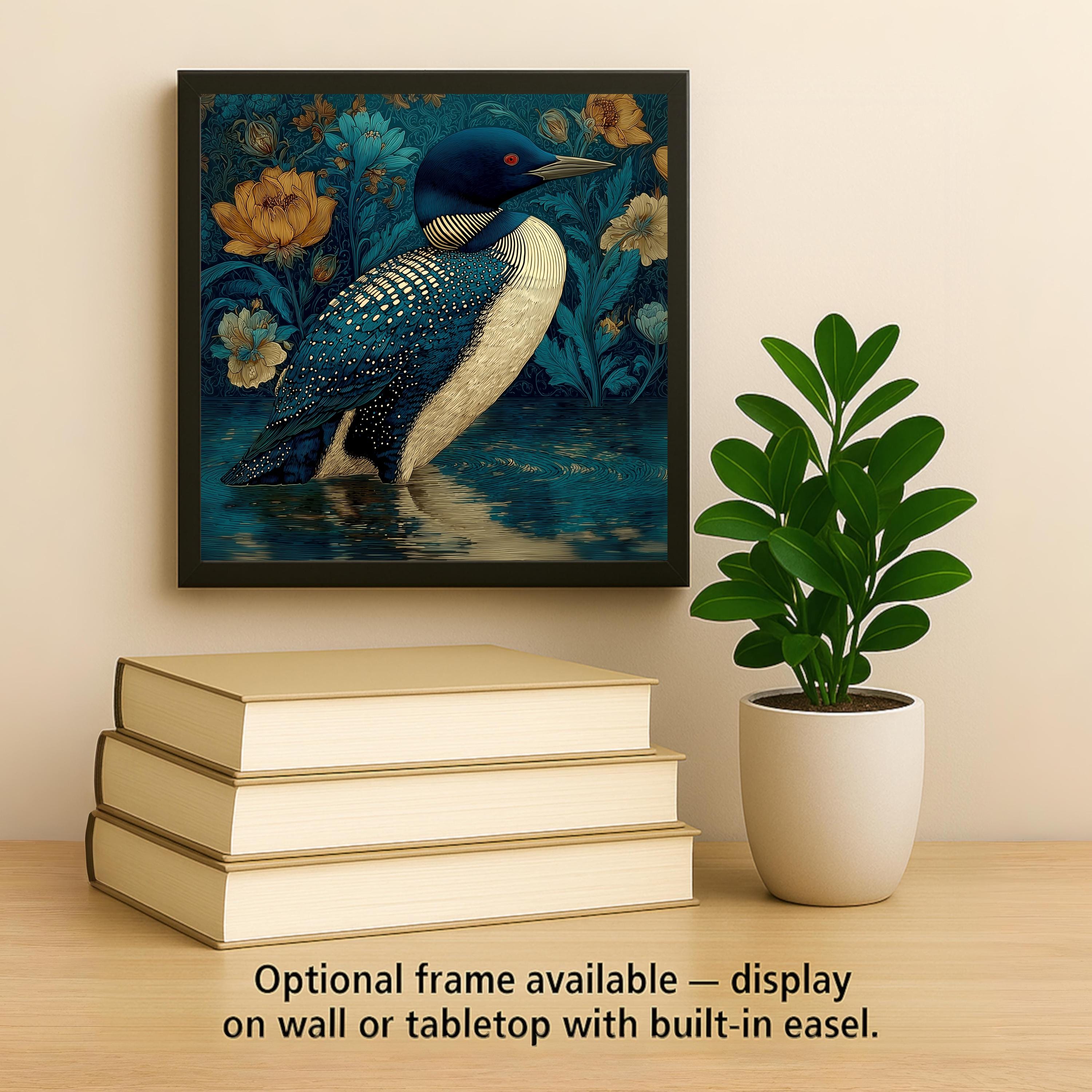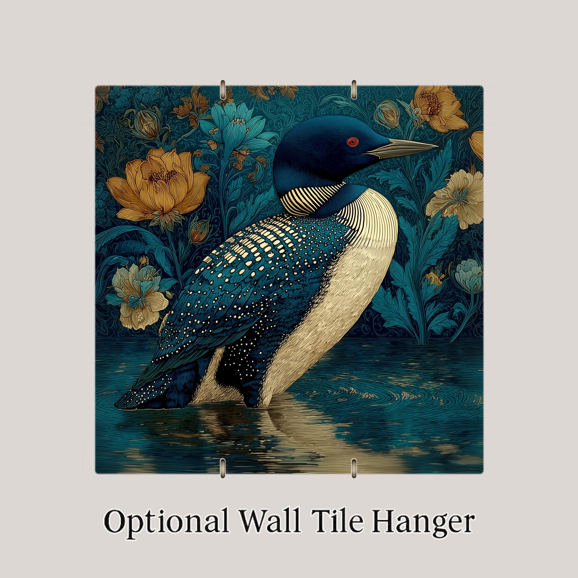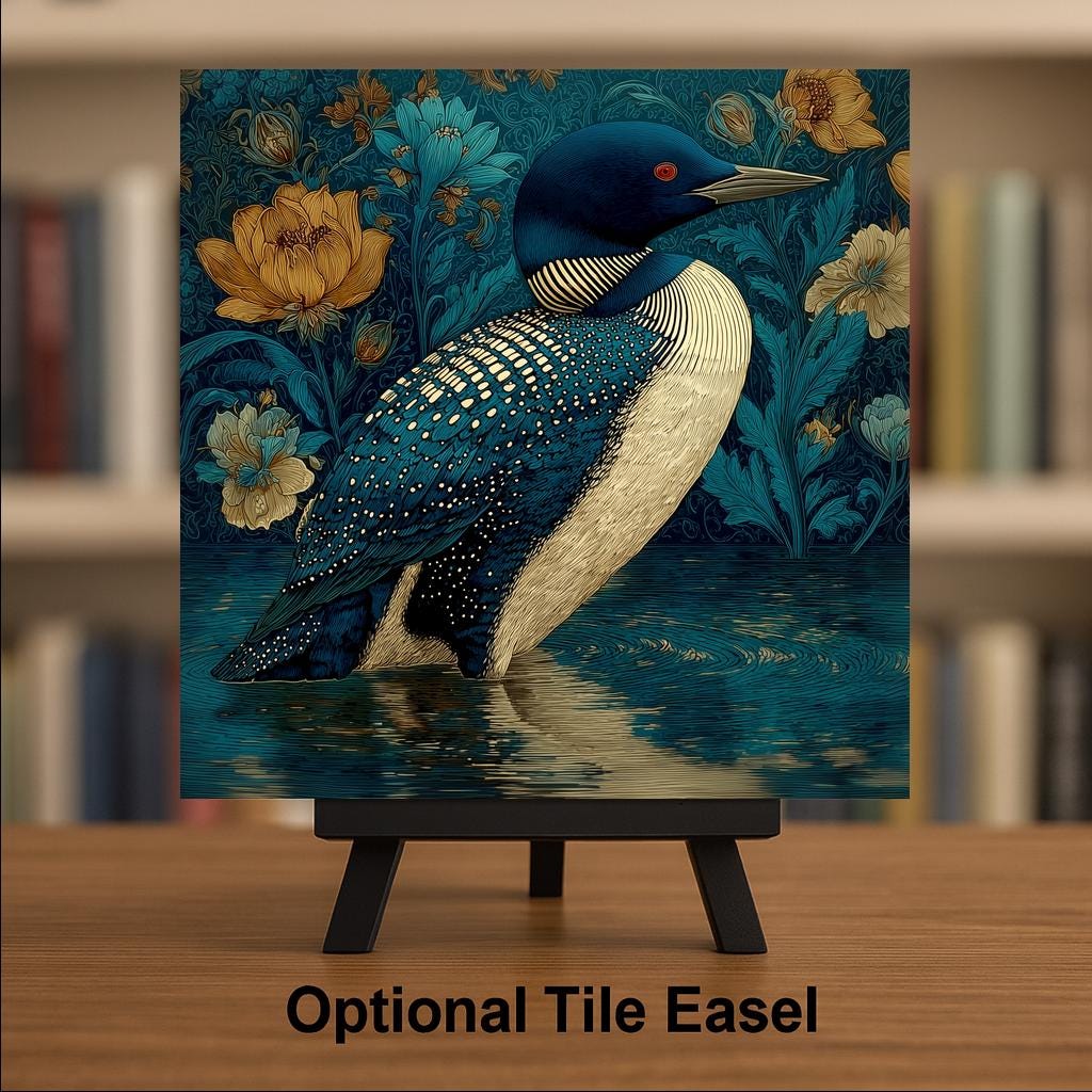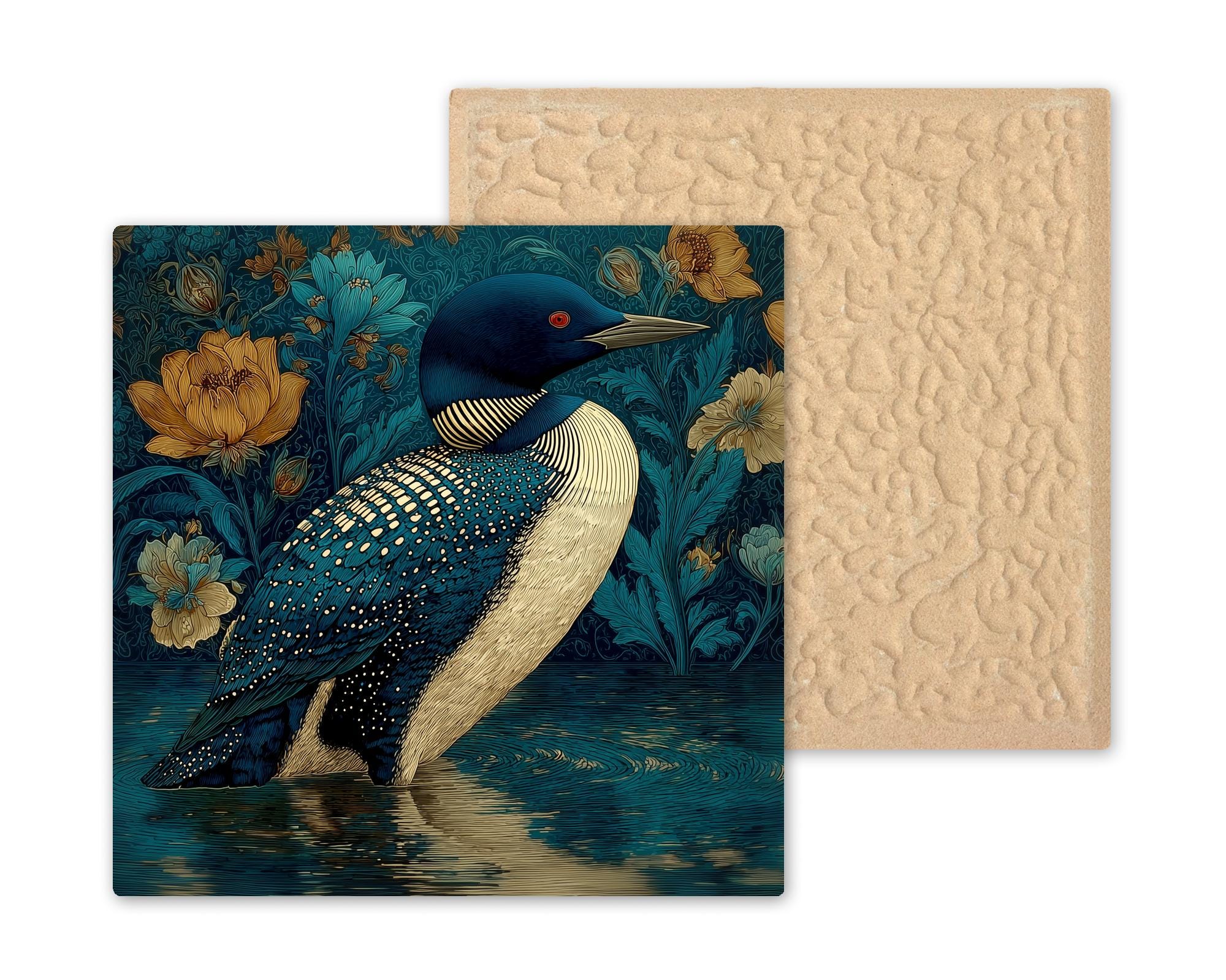 The Art Nouveau loon differentiates from the SG version by its ornamental and decorative quality — the SG is jeweled and precise, the Art Nouveau is flowing and organic. Both are Minnesota state bird tiles, both reach the loon lover and the lake cabin buyer, but through completely different aesthetic lanes. The Art Nouveau version also works for the buyer who collects the WM/AN series in this catalog and wants the most elegant water bird given the most artistically serious treatment.