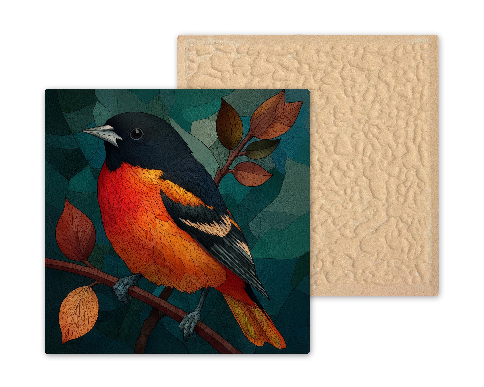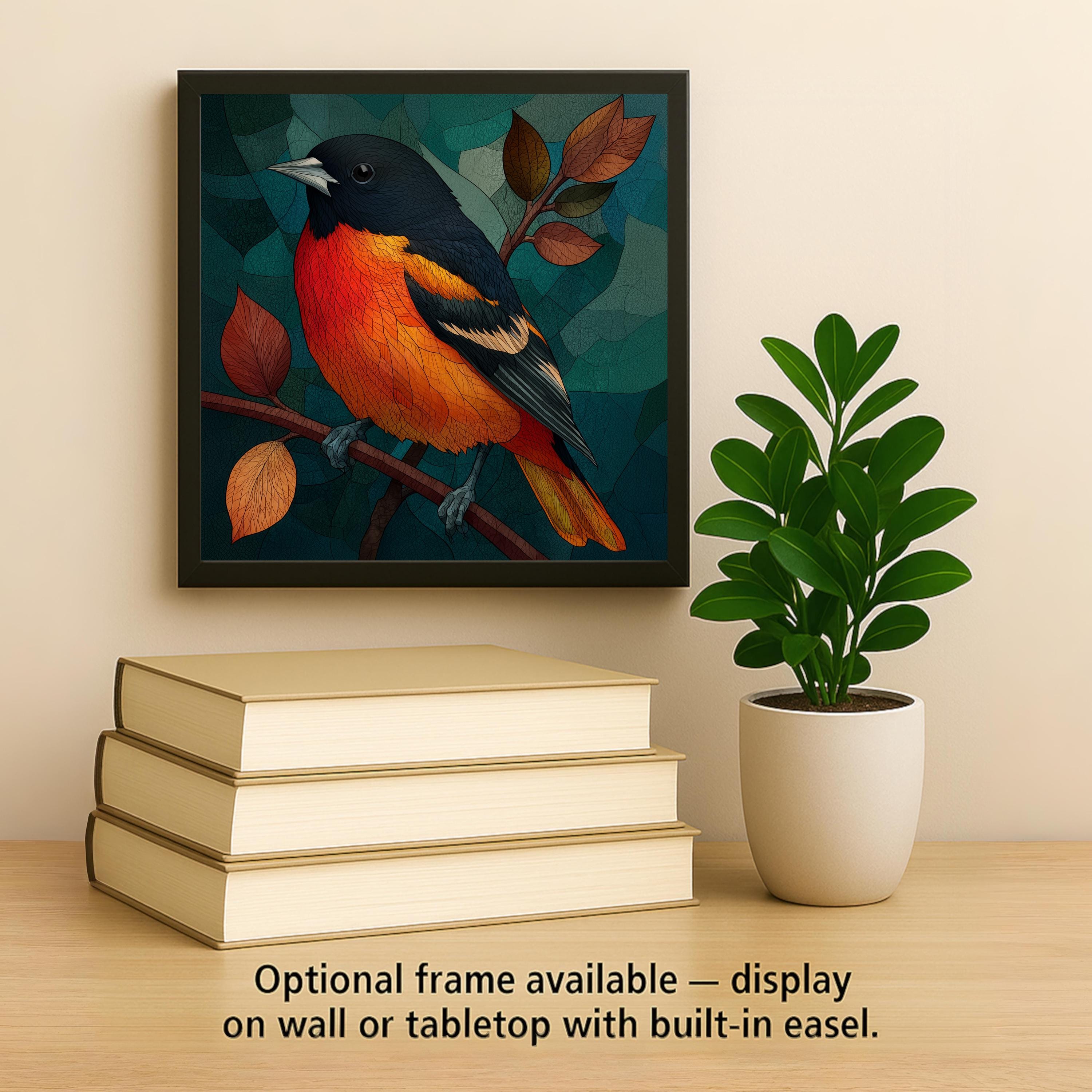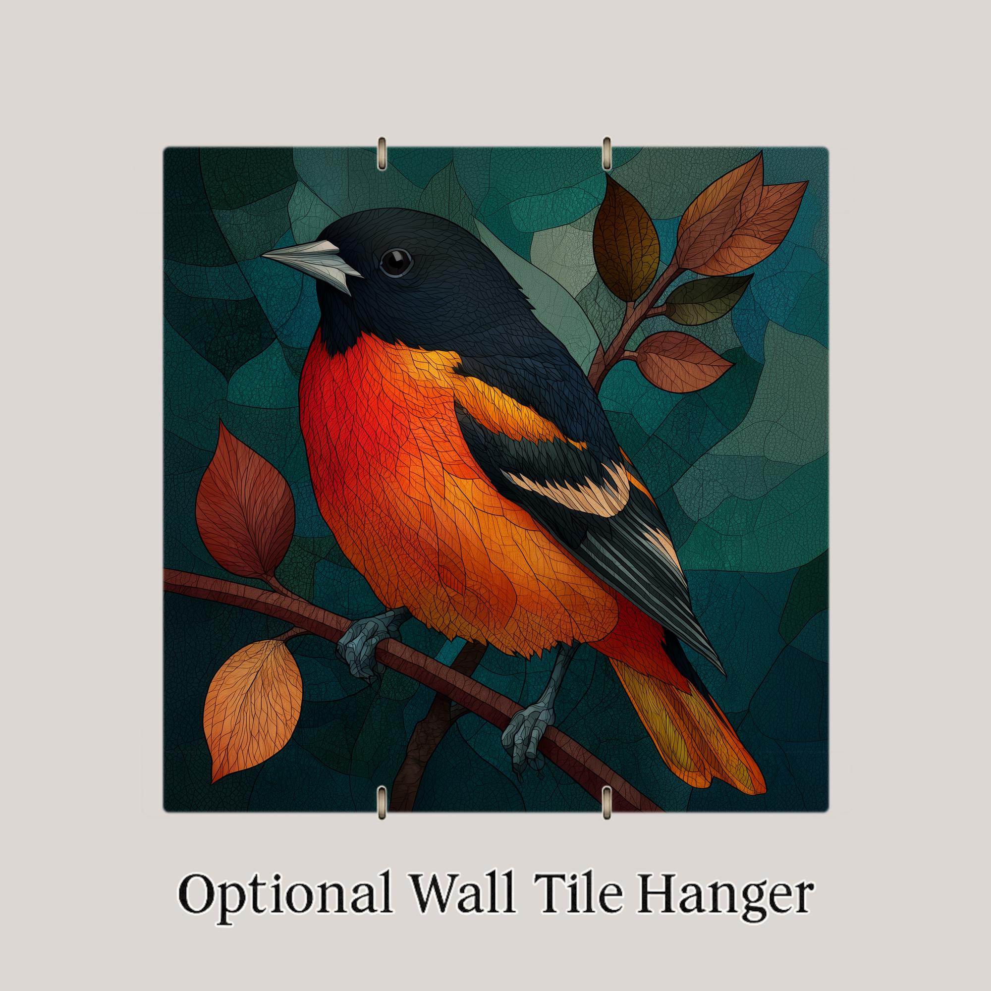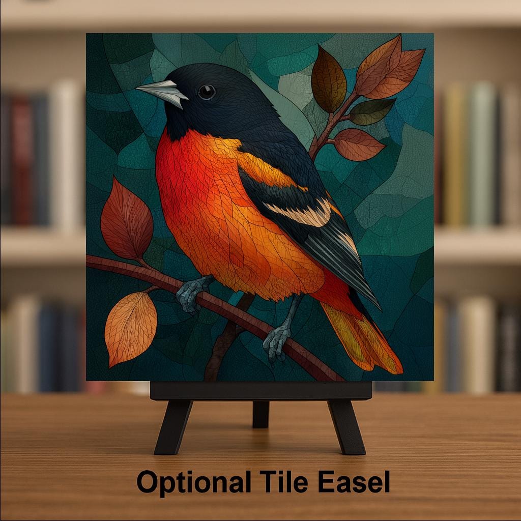 Maryland place identity runs through the Baltimore oriole in multiple directions — the state bird, the baseball team colors, the colonial history, the specific quality of May mornings in the Chesapeake watershed when orioles arrive back from the tropics. This tile works for the Maryland resident, the baseball fan who wants something more artful than a jersey, and the birdwatcher who has set up an orange-halves feeder specifically to attract orioles. No bird in the catalog is better suited to the jeweled SG treatment.