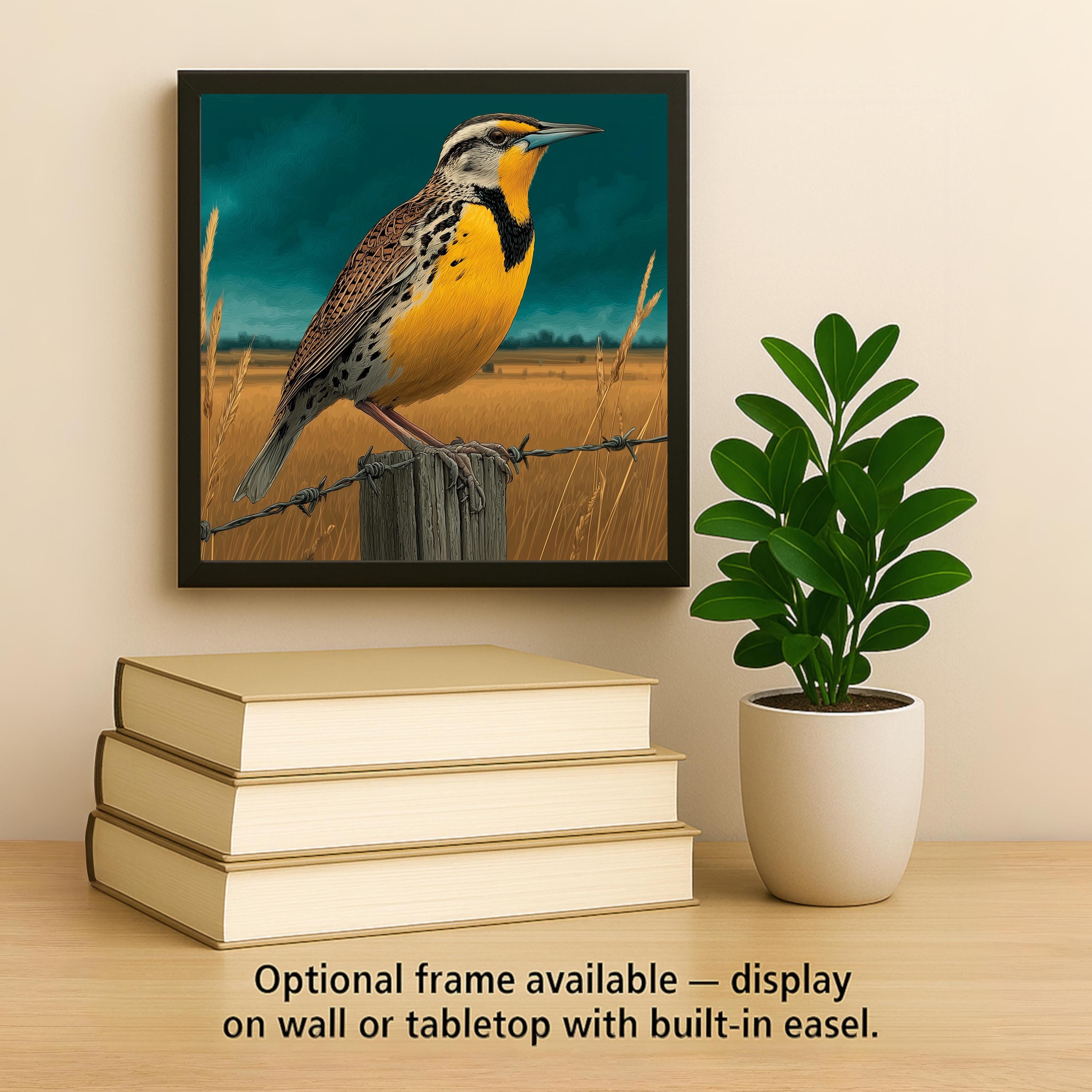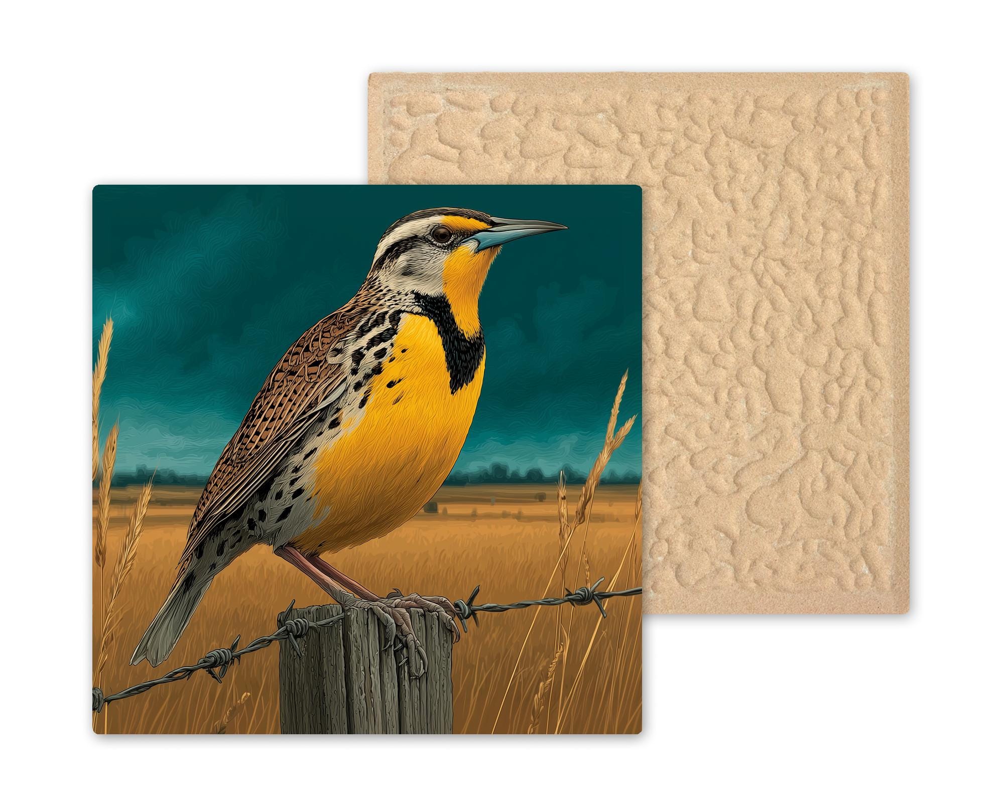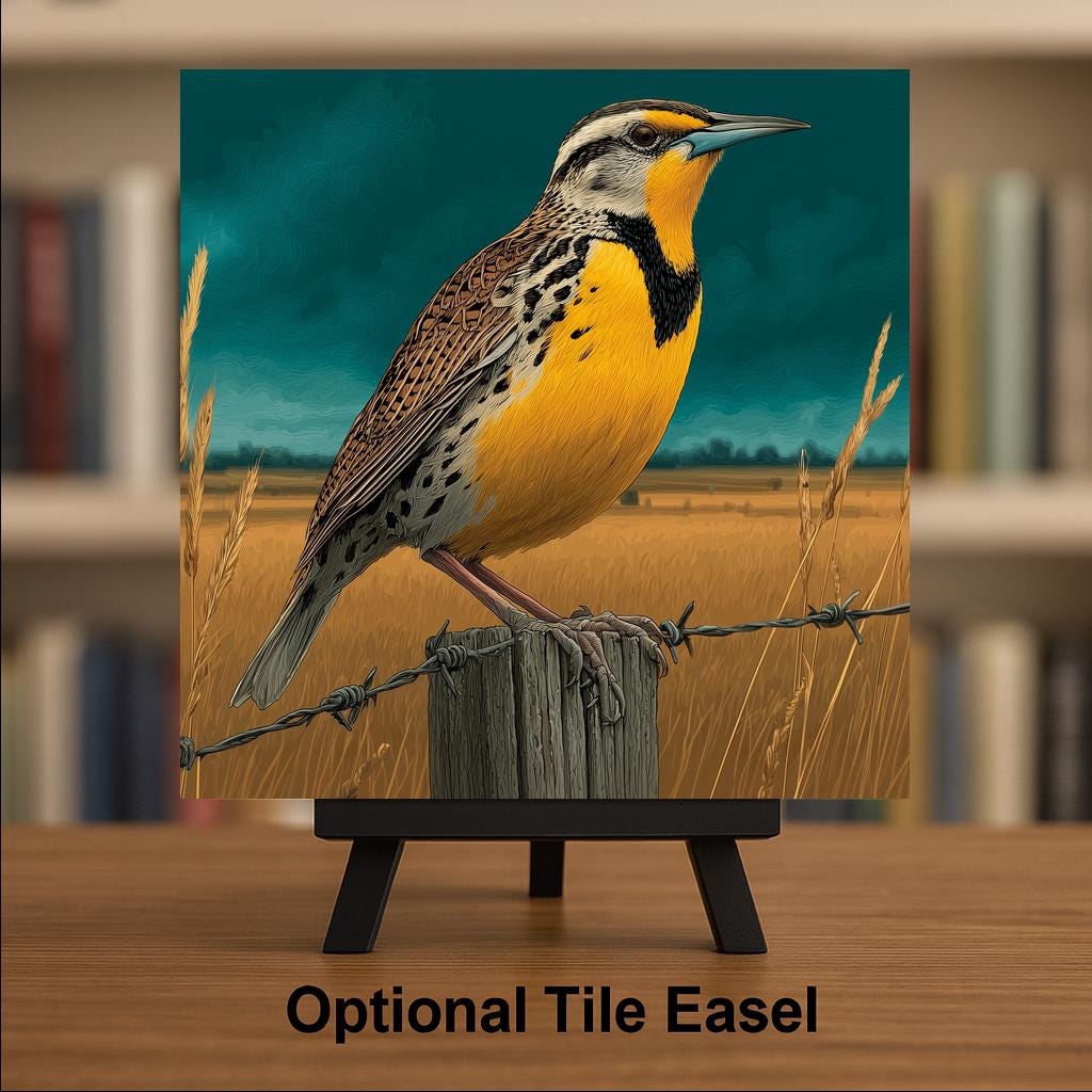 Six states means six distinct buyer pools all searching for the same bird — and the meadowlark is underrepresented in the tile market despite that reach. This tile works for anyone from those six states, the birdwatcher who has stood in prairie grass listening to that song, and the Great Plains and Mountain West identity buyer who wants their regional landscape represented by its most characteristic bird.